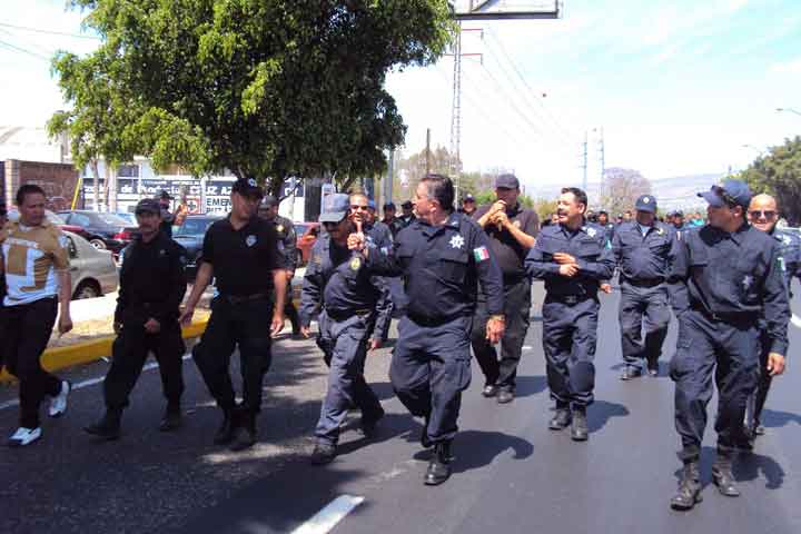 Elementos de la Policía Estatal Preventiva se manifiestan en el primer cuadro de la ciudad como p...