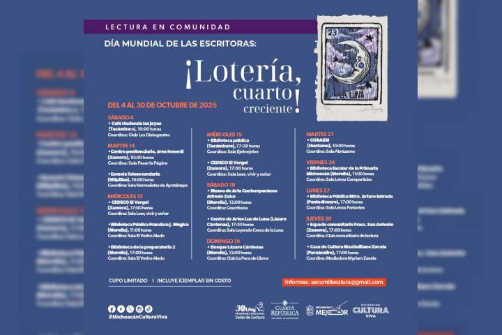 NOTICIAS 07/10/2025 Secum conmemora el DÃa de las Escritoras con lecturas comunitariasPara conmemorar el DÃa Mundial de las Escritoras, la SecretarÃa de Cultura de Michoacán (Secum) realizará durante el mes de octubre, una serie de lecturas comunitarias en diversos municipios del estado.