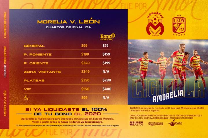 La Directiva del Club Monarcas Morelia determinó no incrementar el costo de los boletos para el juego de Ida de la fase de Cuartos de Final del torneo Apertura 2019 de la Liga MX ante León, a celebrarse tentativamente el miércoles por la noche en el estadio Morelos. Los precios oscilan entre los 99 y 550 pesos.