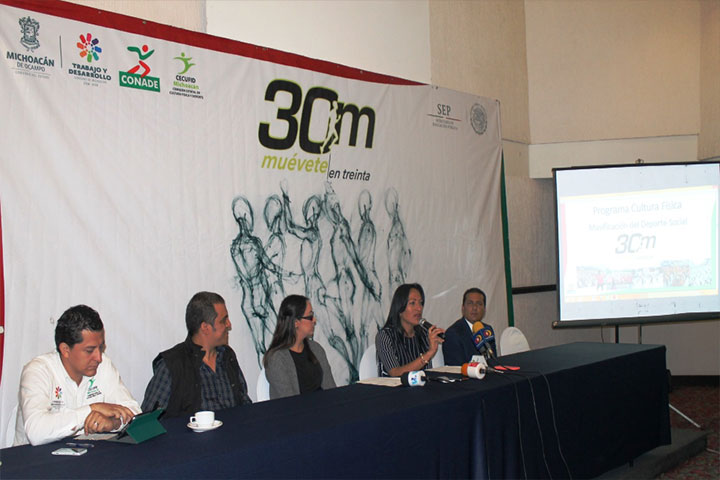 NOTICIAS 18/08/2015Presentan "Muévete en 30"Con el objetivo primordial de combatir el sedentarismo a través de activaciones físicas en escuelas, municipios y recintos de trabajo, fue presentado el programa "Muévete en 30" implementado a nivel nacional vía la Comisión Nacional de Cultura Física y Deporte(Conade), el cual viene a sustituir a "Ponte al 100".