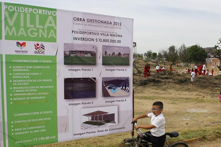 NOTICIAS 06/02/2015Construirán Polideportivo en Villa MagnaCon el objetivo de brindar nuevos y mejores espacios a la sociedad moreliana para la práctica del deporte, el ayuntamiento de la ciudad, anunció la construcción de un Polideportivo en el Fraccionamiento Villa Magna, ubicado en la zona poniente de la capital michoacana, con una inversión federal de 13 millones, 800 mil pesos; dentro del Plan Maestro, se incluye una alberca semiolímpica.