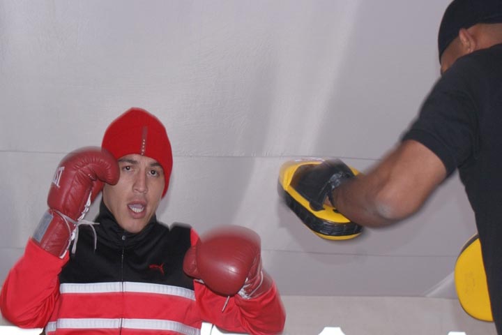 La plaza Melchor Ocampo fungió como extraordinaria sede del entrenamiento entre Jorge "Maromerito" Páez y el colombiano Francisco Fuentes, que comienza a calentar el evento estelar del próximo sábado en el Auditorio Bicentenario y que forma parte de la "Semana Boxística Municipal" promovida por el edil capitalino Wilfrido Lázaro Medina.