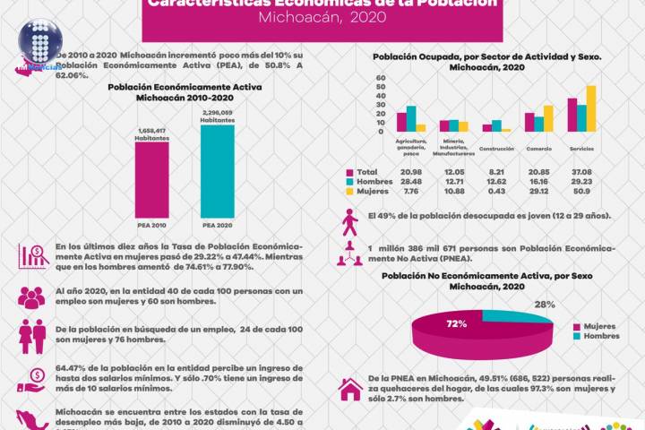 NOTICIAS 23/03/2021En diez años Michoacán aumentó de 51 a 62 por ciento su Población Económicamente Activa: CoespoEn la segunda entrega del Consejo Estatal de Población (Coespo), sobre los datos más significativos para la población en la entidad, con base en los resultados del Censo de Población y Vivienda, 2020 presenta las Características Económicas de la Población.