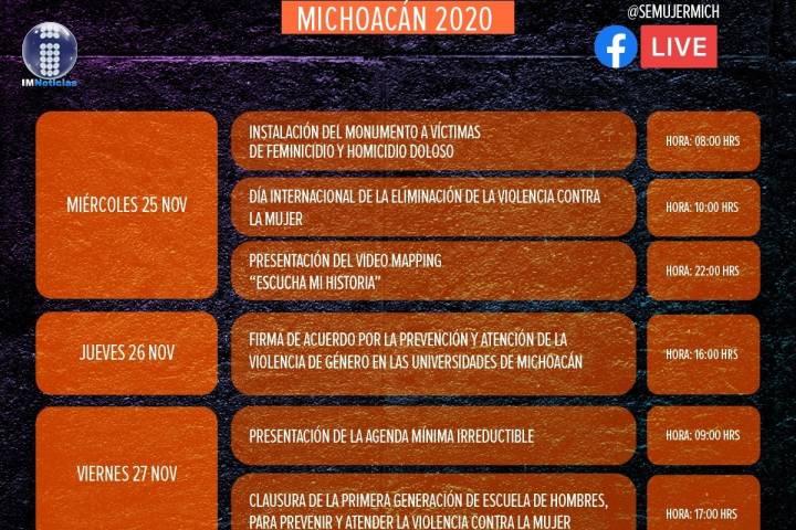 NOTICIAS 24/11/2020Arrancan mañana actividades por la eliminación de la violencia de género En el marco del 25 de noviembre, DÃa Internacional de la Eliminación de la Violencia contra la Mujer, el Gobierno de Michoacán prepara una serie de actividades que permitan visibilizar y sensibilizar a la población sobre el problema de la violencia de género.