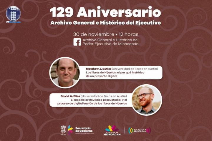 NOTICIAS 16/11/2020Celebrará Archivo General e Histórico del Ejecutivo su aniversario con ponencias virtualesSerá el próximo 30 de noviembre cuando el Archivo General e Histórico del Ejecutivo celebre su 129 Aniversario, mediante un evento virtual en el que participarán dos académicos de la Universidad de Texas, indicó el director de esta área de la Secretaría de Gobierno, Ulises Romero Hernández.