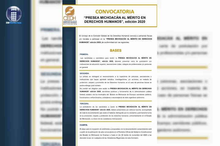 NOTICIAS 17/11/2020Emite CEDH convocatoria para la Presea Michoacán al Mérito en Derechos Humanos 2020La Comisión Estatal de los Derechos Humanos (CEDH) emitió la convocatoria para la Presea Michoacán al Mérito en Derechos Humanos 2020, que año con año otorga el organismo en reconocimiento a las personas físicas o morales que se distingan por sus aportaciones en la protección, respeto y promoción de los derechos humanos en Michoacán.