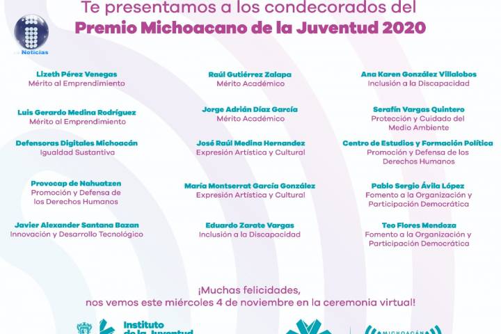 NOTICIAS 02/11/2020Anuncia Ijumich lista de ganadores del Premio Michoacano de Juventud 2020 El Instituto de la Juventud Michoacana (Ijumich) dio a conocer la lista de las y los galardonados del Premio Michoacano de la Juventud 2020, tras ser elegidos de entre más de 180 registros de 93 municipios del estado.