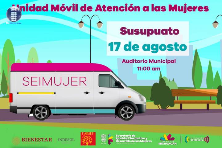 NOTICIAS 16/08/2020Mañana en Susupuato estará la Unidad Móvil de Atención a las Mujeres Dando seguimiento a las medidas de atención y prevención de la violencia contra niñas y mujeres, este lunes 17 de agosto llegará al municipio de Susupuato la Unidad Móvil de Atención a las Mujeres.
