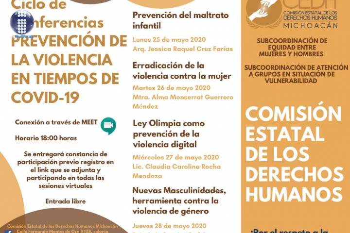 NOTICIAS 25/05/2020Ofrece CEDH segundo ciclo de conferencias virtuales sobre prevención de la violencia en tiempos de Covid-19Un segundo Ciclo de Conferencias Virtuales sobre Prevención de la Violencia en Tiempos de Covid-19 ofrece la Comisión Estatal de los Derechos Humanos (CEDH), derivado de la demanda registrada durante el primer evento y para continuar con las actividades de capacitación y divulgación de los derechos humanos a distancia, en tanto se restablecen las actividades presenciales.