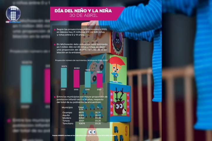 NOTICIAS 30/04/2020Presenta Coespo cifras sobre infancia en Michoacán De acuerdo con información del Consejo Estatal de Población, al año 2020 en Michoacán, hay 1 millón 355 mil, 049 niñas y niños entre 0 y 14 años, es decir 28.1 por ciento de la población del total en la entidad.
