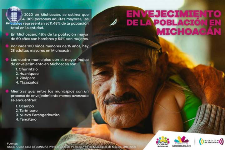 NOTICIAS 27/02/2020Michoacán a tiempo de atender el envejecimiento de la población: CoespoSe estima que al año 2020 en Michoacán 554 mil 069 personas son adultos mayores de 60 años, las cuales representan el 11.48 por ciento de la población total en la entidad, esto de acuerdo con información proporcionada por la SecretarÃa de Gobierno a través del Consejo Estatal de Población (Coespo).
