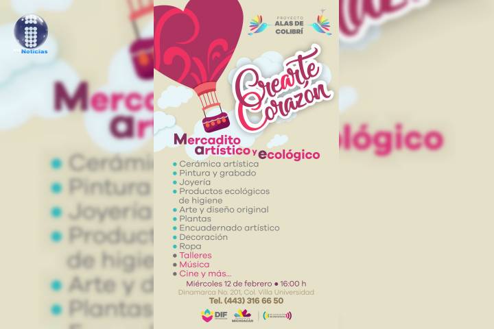 NOTICIAS 05/02/2020Invita DIF Michoacán a venta de productos artísticos y ecológicos El Sistema para el Desarrollo Integral de la Familia, DIF Michoacán, invita a su Mercadito Artístico y Ecológico que realizará el próximo 12 de este mes, de las 16:00 a las 19:30 horas en las instalaciones del Centro de Educación Artística y Cultural (CEAC) "José María Morelos", ubicado en la calle Dinamarca #201 esquina con Nicolás Bravo, colonia Villa Universidad, en Morelia.