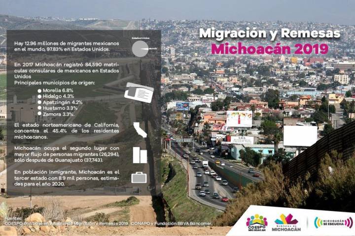 Michoacán situado en la posición número uno, con 10.1 por ciento del total de remesas recibidas en el país que representan 3 mil 392 millones de dólares. Le siguen Jalisco con 3 mil 287 millones, Guanajuato 3 mil 045 y Estado de México 1 mil 902 millones de dólares.