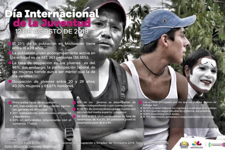 NOTICIAS 12/08/2019Fundamental aprovechar el potencial social y económico de los jóvenes en Michoacán: Coespo En el marco del Día Internacional de la Juventud a celebrarse el próximo 12 de agosto, la Secretaría de Gobierno a través del Consejo Estatal de Población (Coespo) presenta información sobre ocupación y empleo de los jóvenes en Michoacán.