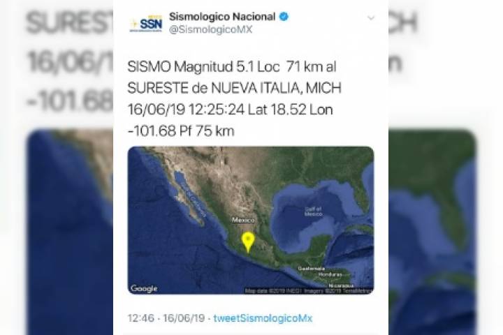 De acuerdo a información emitida por el Servicio Sismológico Nacional, el movimiento se presentó a 71 km al Sureste de Nueva Italia, a la 12:25:24.