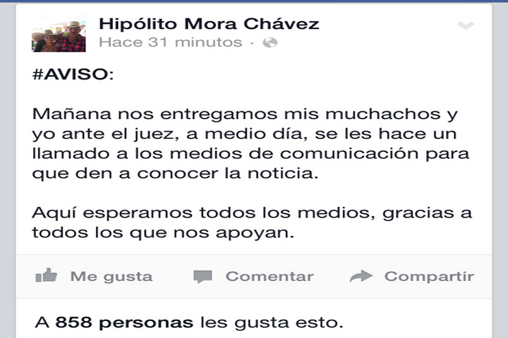NOTICIAS 26/12/2014Este sábado se presentará ante el juez Hipólito Mora A través de Facebook, Hipólito Mora Chávez, precursor de los grupos de autodefensas, dio a conocer que el día de mañana se presentará ante el juez para declarar sobre los hechos ocurridos el pasado 16 de diciembre en la comunidad de La Ruana en el municipio de Buenavista, Tomatlán.