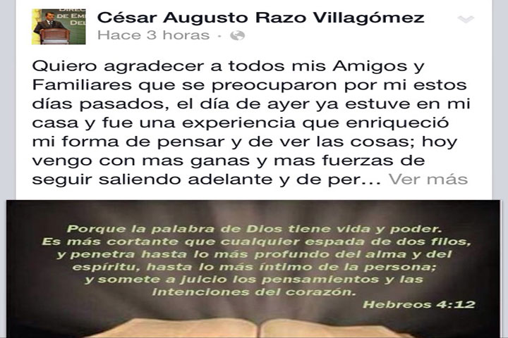 El funcionario durante la administración de Leonel Godoy, dio a conocer mediante su cuenta de facebook que desde el pasado viernes regreso a su casa con sus familiares.