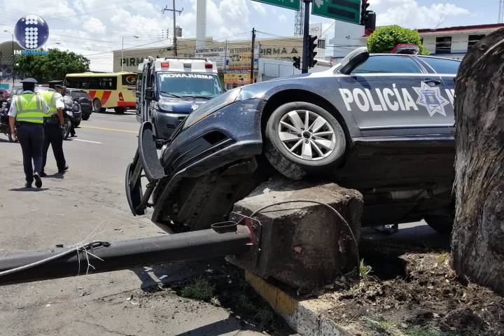 Una patrulla de la Policía de Morelia quedó parcialmente volcada tras chocar primeramente contra un auto particular y luego contra un semáforo de la Avenida Madero Poniente, accidente que dejó tres personas levemente heridas, dos de ellas mujeres policías.