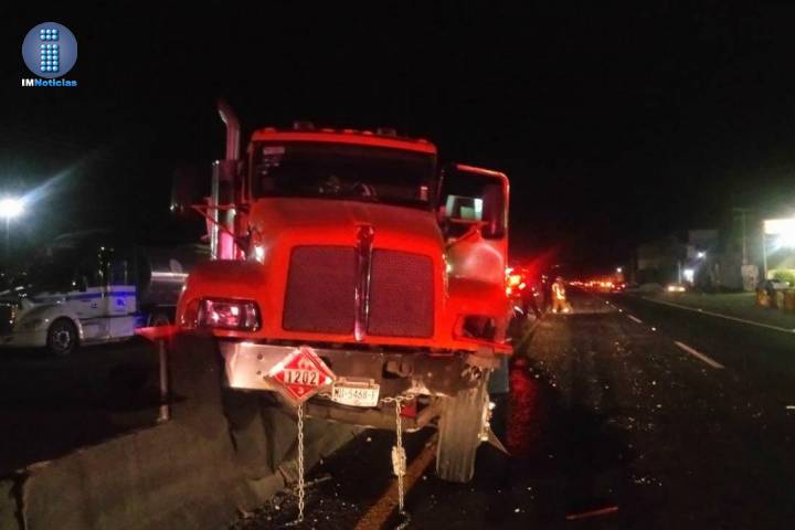 Un camión pipa se salió de control y se trepó a un muro de contención en la carretera Morelia-Salamanca, uno de dichos bloques se movió hacia los carriles del sentido contrario y un coche se impactó contra el mismo, por fortuna el accidente no dejó víctimas que lamentar, a decir de contactos oficiales.