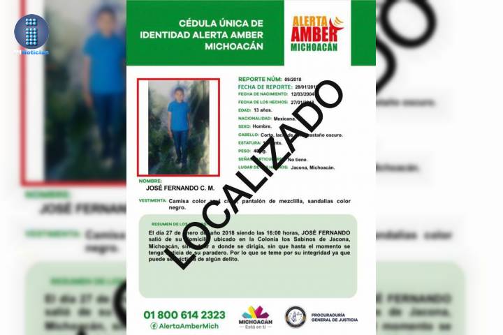 La ProcuradurÃa General de Justicia del Estado (PGJE), a través de la FiscalÃa Especializada en Personas Desaparecidas, logró la localización de un menor de edad que habÃa sido reportado desaparecido en este municipio de Jacona.