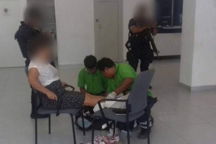 En plena sucursal bancaria una mujer resultó lesionada por una bala "perdida", cuando a un oficial rural del Ejército Mexicano se le "escapó" un disparo, según trascendió en la labor periodística.