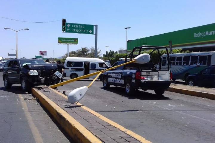 Una joven automovilista resultó ilesa después de que la camioneta en la que iba se trepó a un camellón y derribó un poste del alumbrado público, esto en la Avenida Francisco I. Madero, en esta ciudad de Apatzingán.