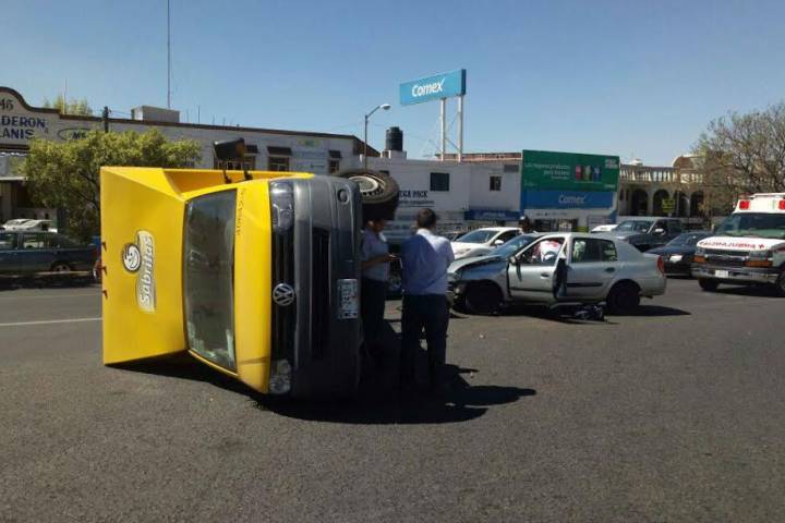Un lesionado leve y daños materiales fue el resultado de un aparatoso choque entre un auto compacto y una camioneta de la empresa Sabritas, la cual terminó volcada sobre el Periférico Revolución, a la altura de la colonia San Rafael.