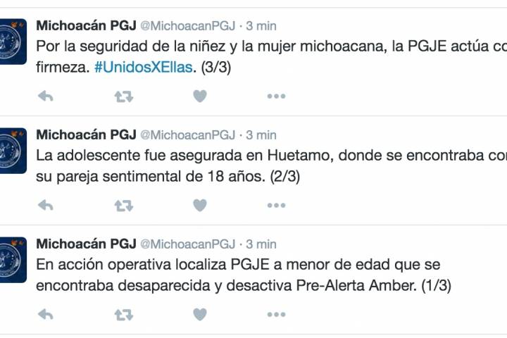 NOTICIAS 30/11/2016Adolescente reportada como desaparecida es localizada con su pareja sentimental en HuetamoDerivado de trabajos de investigación e inteligencia llevados a cabo en coordinación con la Fiscalía Especializada en Personas Desaparecidas y la Fiscalía Regional de Zitácuaro, fue localizada una menor de edad en el municipio de Huetamo y se desactivó Pre-Alerta Amber.