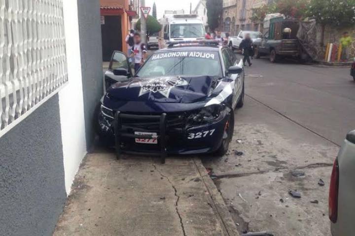 Un automóvil se le atravesó a una patrulla de la Policía Michoacán, instante en que el oficial que manejaba dio un "volantazo" y así su unidad chocó contra una camioneta que estaba estacionada, él resultó lesionado, de acuerdo con la información obtenida en el lugar de los hechos.