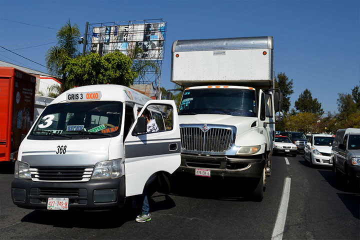 Un choque entre un camión de caja cerrada y una combi de la Ruta Gris 3 dejó únicamente daños materiales; hecho registrado sobre el Periférico Revolución, a la altura de la salida a Mil Cumbres, en esta capital.