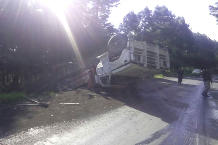 Un camión tipo rabón volcó en la carretera Aporo - Angangueo, momento en que el chofer resultó herido y fue hospitalizado, además hubo daños materiales.