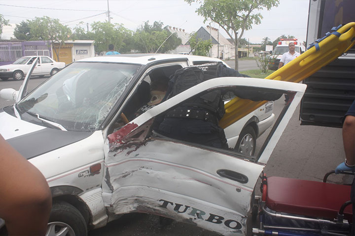 Una camioneta impactó a un automóvil del lado izquierdo, instante en que el chofer de esta unidad resultó lesionado al quedar prensado, siendo ayudado y canalizado a un hospital por los socorristas locales y de la Federal.