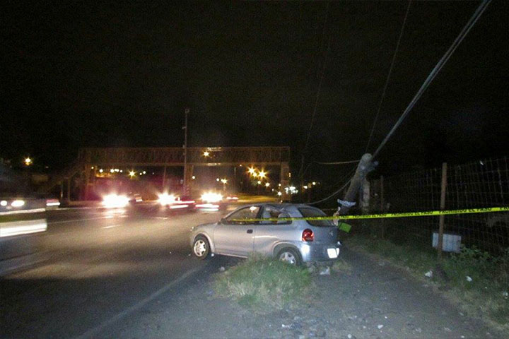 Un auto fue abandonado por su o sus ocupantes tras haber embestido y derribado un poste de teléfonos, así como un señalamiento vial localizados a la orilla de la carretera Morelia-Quiroga, justo a la altura del kilómetro 10, a escasos metros del fraccionamiento Villas del Pedregal.