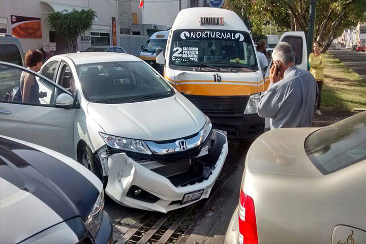 Dos personas con lesiones leves y daños materiales fue el resultado de un choque múltiple entre dos automóviles y una combi de la Ruta Amarilla, según se conoció en la labor reporteril.
