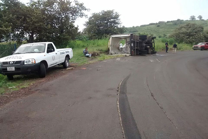 Un camión torton doble rodado terminó volcado sobre la carretera y su chofer resultó herido levemente; unidad que trasladaba un cargamento de fertilizante proveniente de Guadalajara.