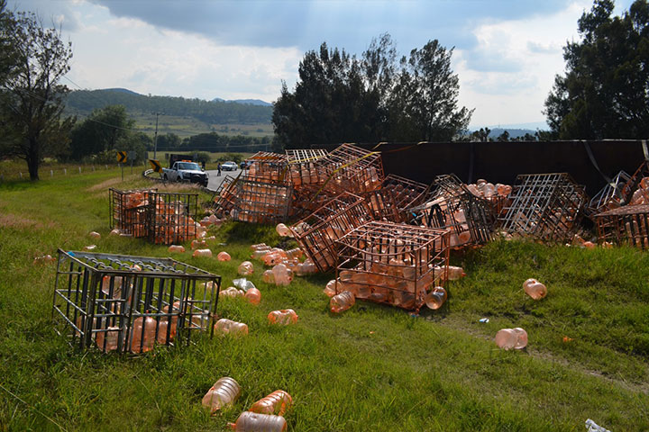 Un tráiler de la empresa Bonafont que iba cargado con mil garrafones, con un peso total de 19 toneladas, volcó en la carretera Indaparapeo - Charo, lo cual dejó cuantiosas pérdidas materiales, pero afortunadamente no hubo heridos ni muertos, de acuerdo con los datos recabados en el lugar de los hechos.