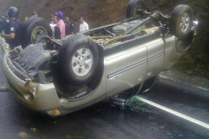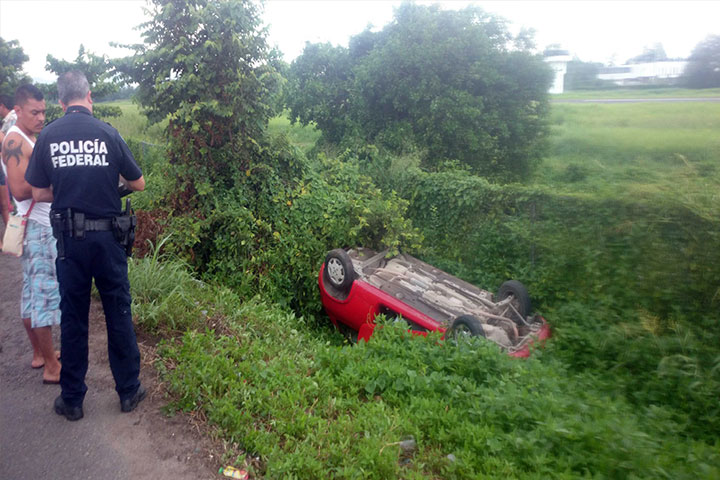 Heridas leves padeció una conductora embarazada cuando su automóvil volcó tras ser impactado por un vehículo de carga sobre la carretera Lázaro Cárdenas - Tenencia de Las Guacamayas, a la altura del Aeropuerto, donde minutos después se presentaron unos paramédicos de Protección Civil (PC), quienes la auxiliaron.
