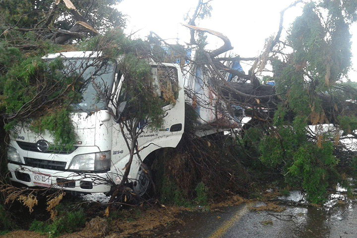 Debido a la fuerte lluvia que se presentó la tarde- noche de este sábado, un árbol cayó sobre un vehÃculo, cuando este transitaba sobre la carretera Quiroga- Zacapu, a la altura de la comunidad de Santa Fe de la Laguna, perteneciente al municipio de Quiroga.