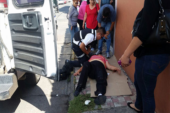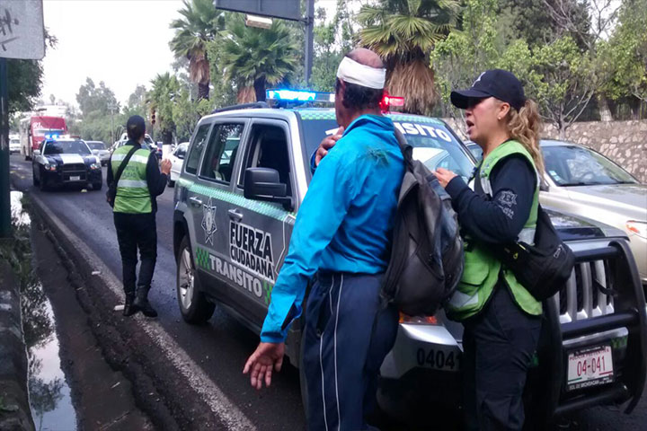 Un anciano que viajaba a bordo de su bicicleta sufrió una accidental caída sobre el Periférico Independencia, justo en la pendiente localizada en las inmediaciones de Casa de Gobierno, frente a un negocio de mofles.