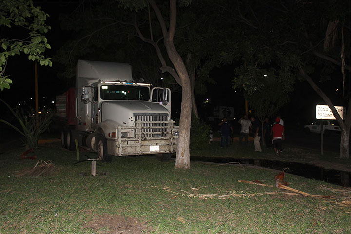 Un tráiler acabó trepado en un camellón después de que le fallaran los frenos, accidente registrado en la avenida 22 de Octubre, a la altura del Monumento al General Lázaro Cárdenas, en esta ciudad.