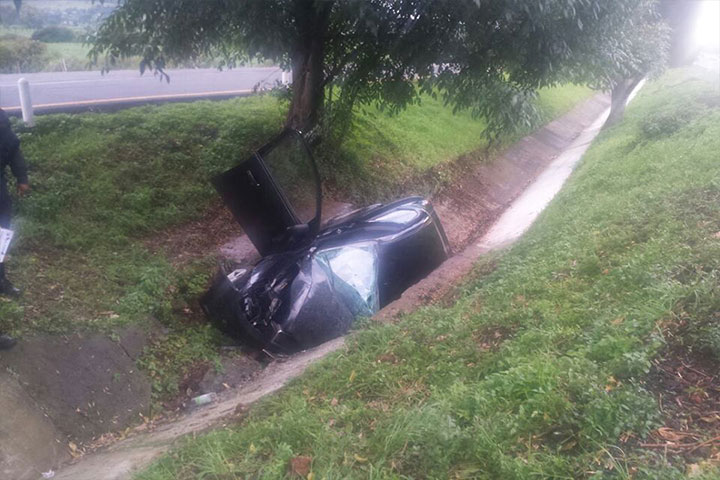 Una conductora uruapense resultó herida cuando su auto abandonó intempestivamente la carpeta asfáltica y terminó volcado dentro de una cuenta del drene pluvial, localizada en el camellón central del tramo carretero Pátzcuaro - Morelia.
