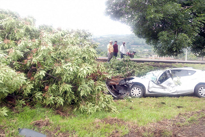 El chofer de un automóvil resultó lesionado cuando su unidad se salió del camino y chocó contra un árbol; el vehículo quedó completamente destrozado, el hombre salvó la vida de milagro.