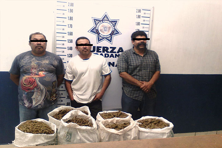 Tres hombres fueron arrestados, con aproximadamente 55 kilogramos de marihuana, la cual transportaban en una camioneta.