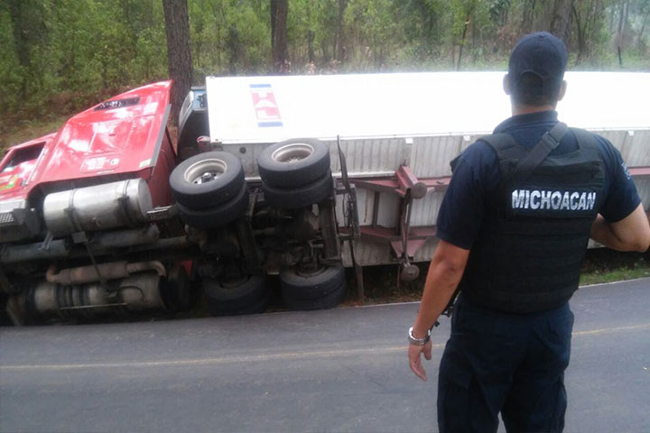Un tráiler que transportaba un cargamento de aguacate volcó en la carretera Opopeo-Tacámbaro, en este municipio, sin que hubiera víctimas humanas que lamentar.