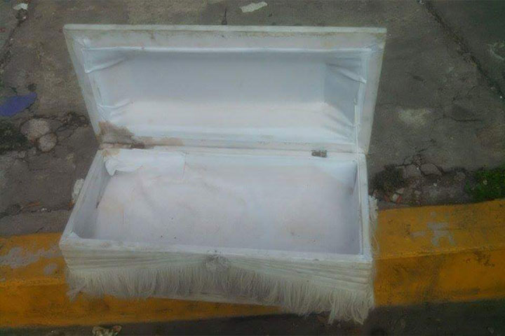 Un ataúd para niño fue dejado en la zona centro de esta ciudad de Apatzingán, lo cual causó temor entre la población, pues el féretro tenía manchas rojas. La caja estaba vacía, dijeron las autoridades ministeriales.