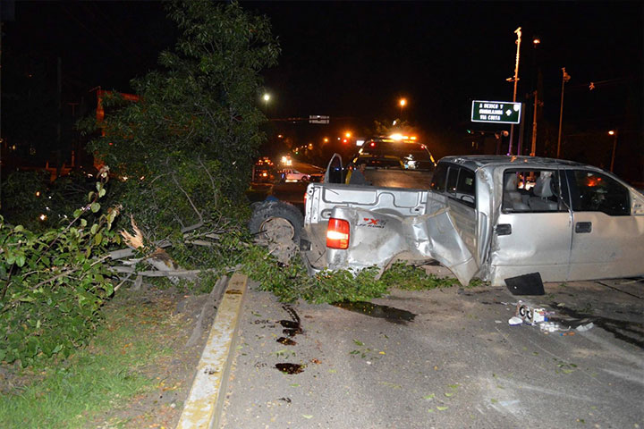 Dos personas resultaron heridas cuando la camioneta en la que viajaban chocó contra un vehículo compacto, luego derribó tres arbustos, así como un poste metálico del alumbrado público, ubicado en camellón central de la avenida Camelinas, y finalmente volcó.