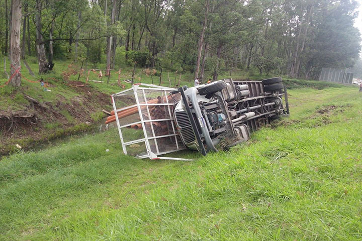 Dos hombres originarios del estado de Querétaro resultaron ilesos luego de que volcara el camión de carga en el que se trasladaban, de acuerdo con la información obtenida por esta agencia de noticias.