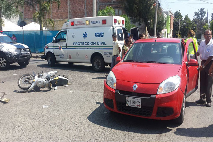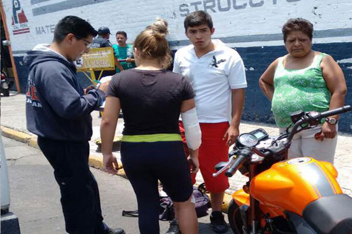 Una mujer que viajaba como copiloto en una motocicleta sufrió severas lesiones en su cuerpo, luego de chocar su unidad contra un auto que dio una vuelta en u en un cruce vehicular de mayor afluencia en esta ciudad, por fortuna su esposo e hija de meses de nacida salieron ilesos de este percance.