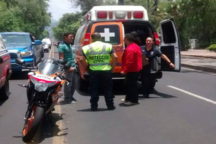 Varias contusiones sufrió un motociclista al ser impactado por un automóvil tripulado por una mujer, accidente que se registró frente a las oficinas de Finanzas, sobre la avenida Ventura Puente.