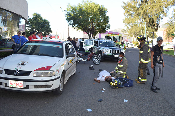 NOTICIAS 20/05/2015Motociclista choca por alcance contra un taxi y queda lesionadoUn motociclista resultó lesionado después de chocar por alcance contra un taxi, momento en que salió proyectado y cayó al asfalto, después de ello fue hospitalizado, trascendió durante la cobertura noticiosa.